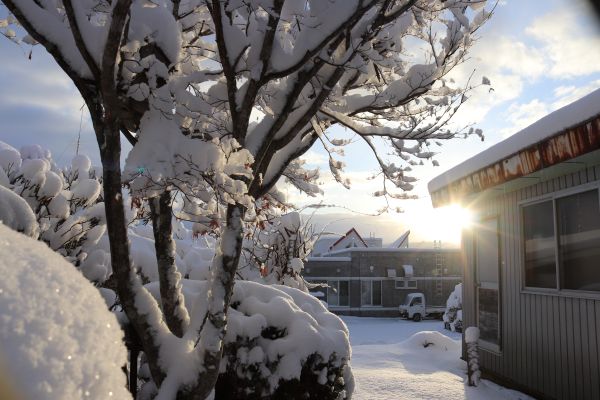 こんもりと積もった雪、朝日に映えて綺麗です。