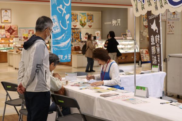 行列のできるお店も。会場入り口左には水揚げ日本一の苫小牧ホッキの商品が色々。