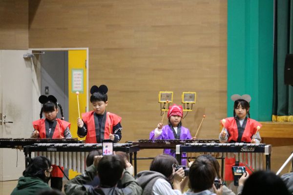 写真上2枚は、1年生の音楽マウスパーティー「おむすびころりん」の場面より。