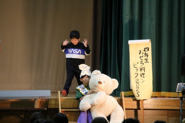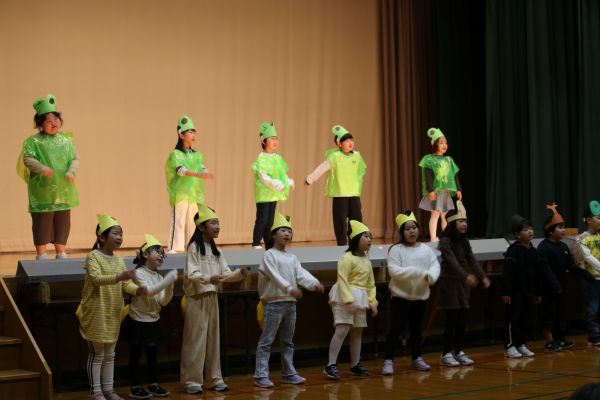写真上2枚は、4年生の劇「おせち料理ンピック2025」の場面より。