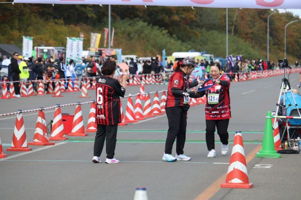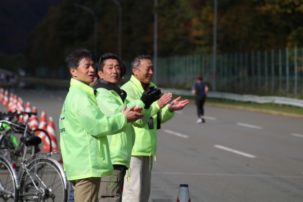 本日最高齢90歳(写真中央紫のTシャツ)のランナーを応援する有森さん。